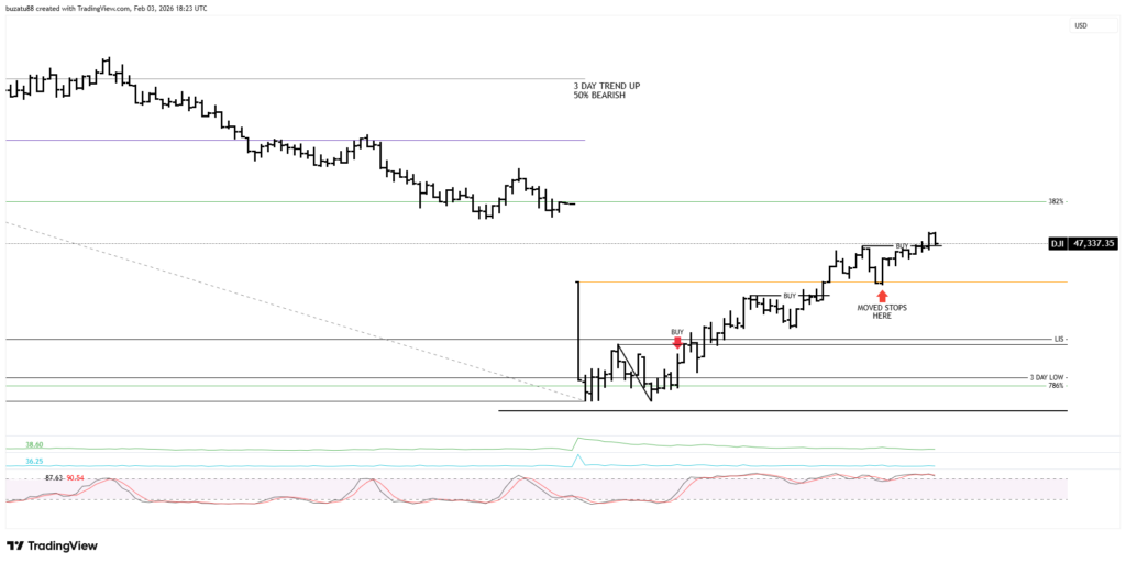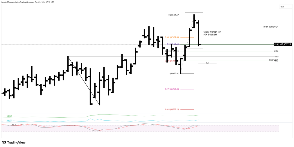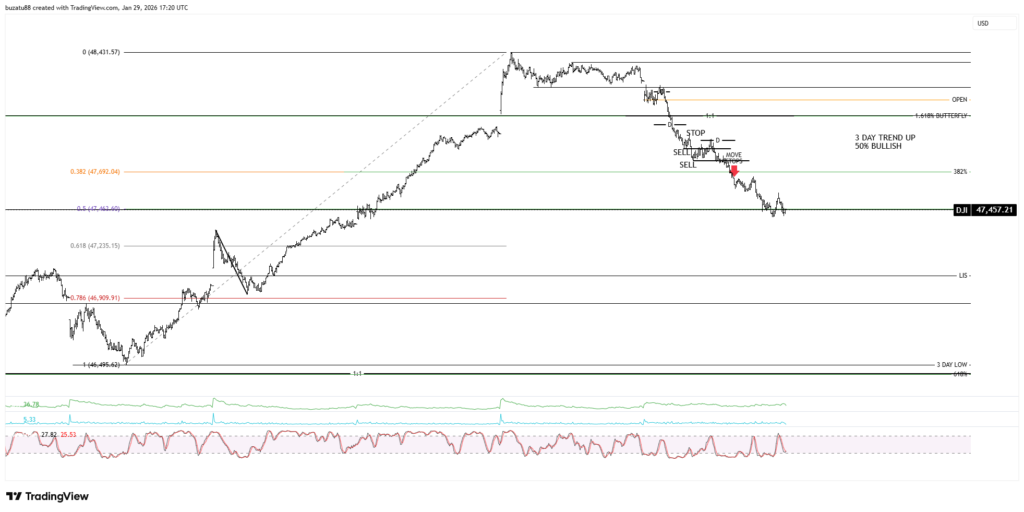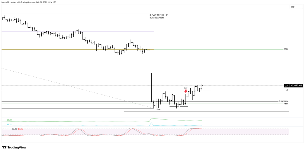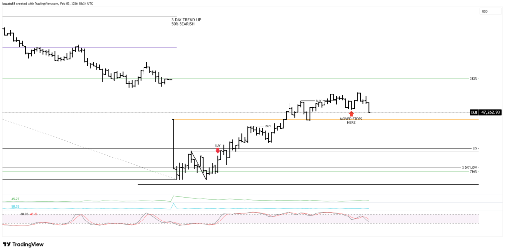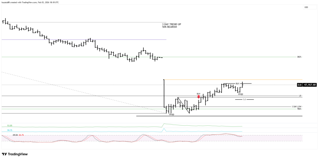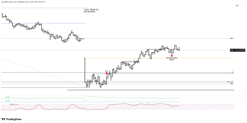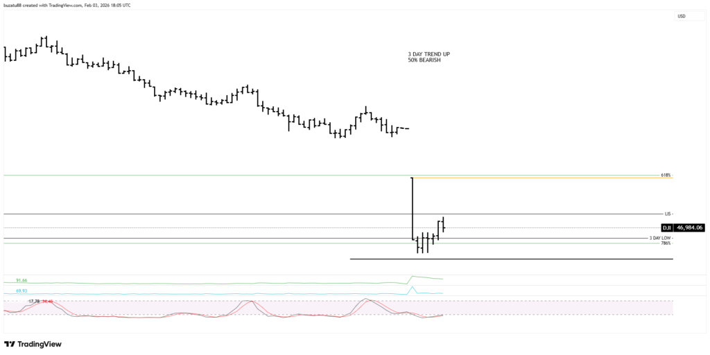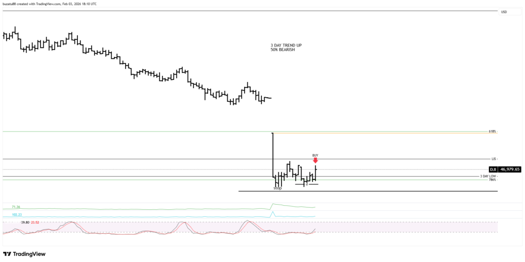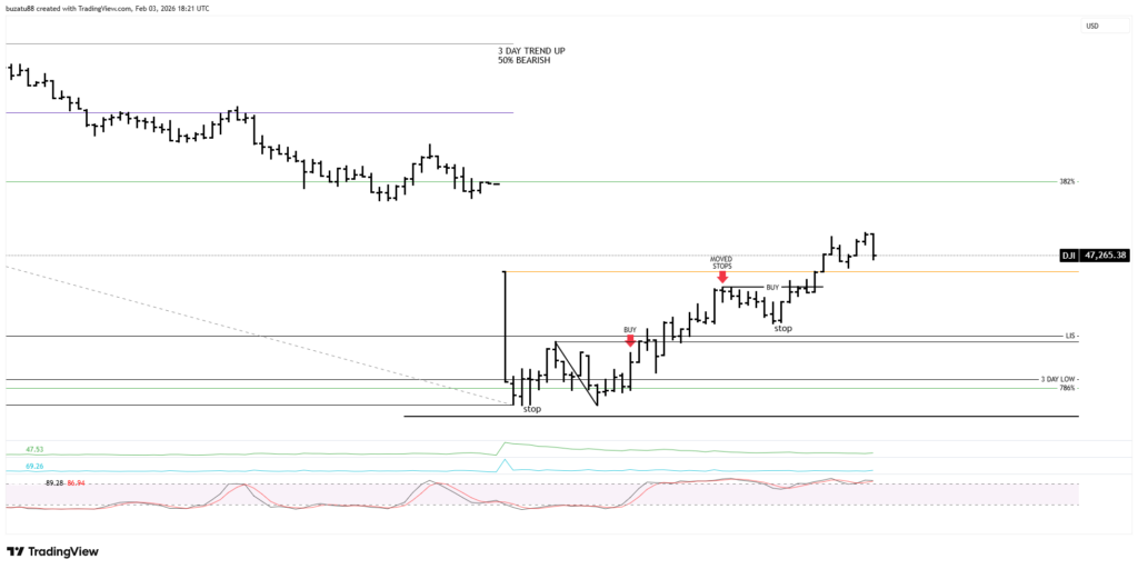 The 3-day medium trend at 46,934 is still up, but from a stochastic point of view is overbought. And the 50% support has been breached slightly. In my opinion, right now the market will move lower, but I have to wait and see what signs I will receive once the market opens.