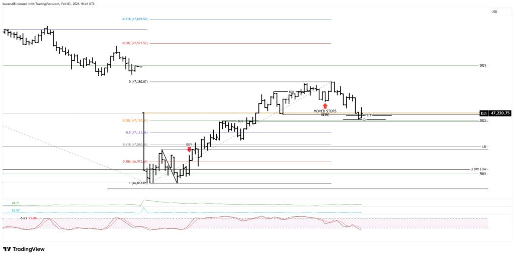 This Dow Jones intraday trading analysis documents how I approached a volatile market session using structure rather than prediction. The market opened with increased volatility, and my focus was on how the price reacted around key retracement levels, ABCD patterns, and the average true range. I was not interested in guessing direction but in observing what the market was doing and responding accordingly.
